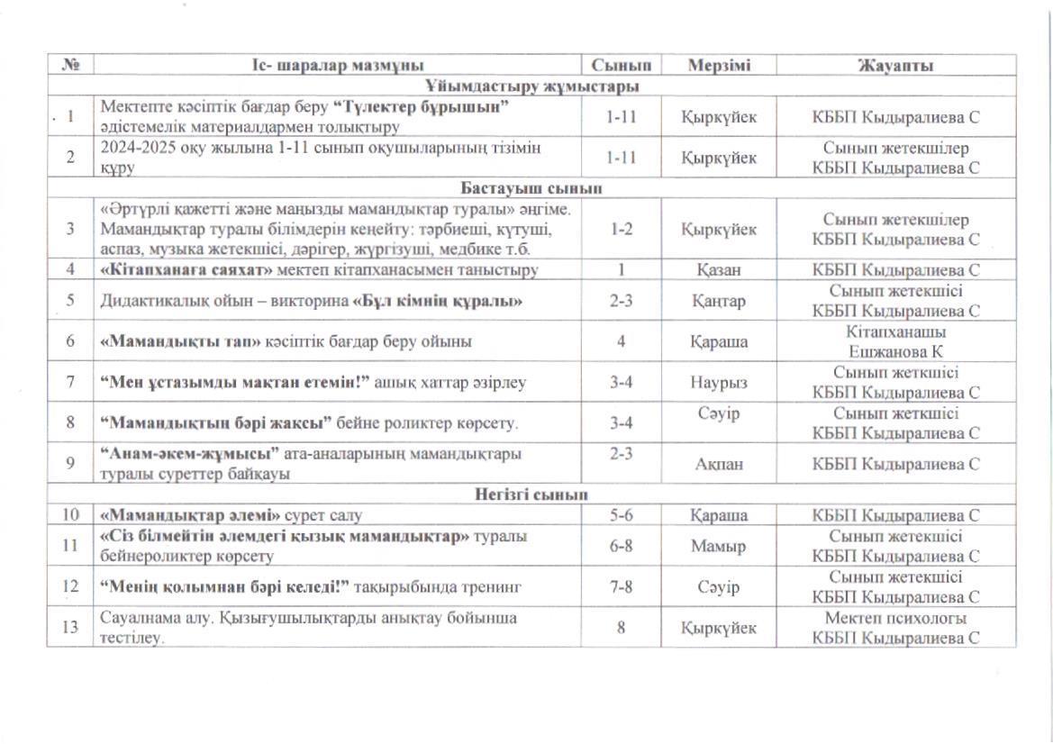 » » КӘСІБИ БАҒДАР БЕРУ ПЕДАГОГІ ЖҰМЫС ЖОСПАРЫ 2024-2025 ОҚУ ЖЫЛЫ